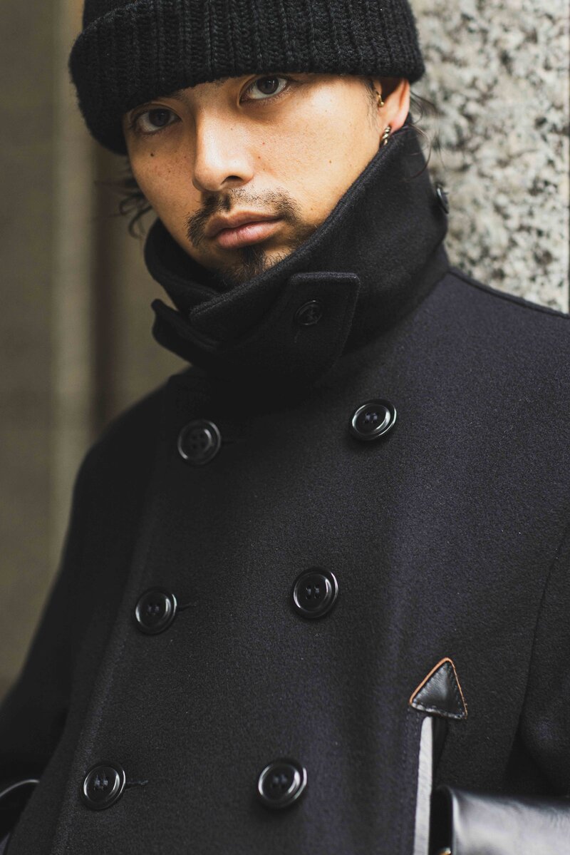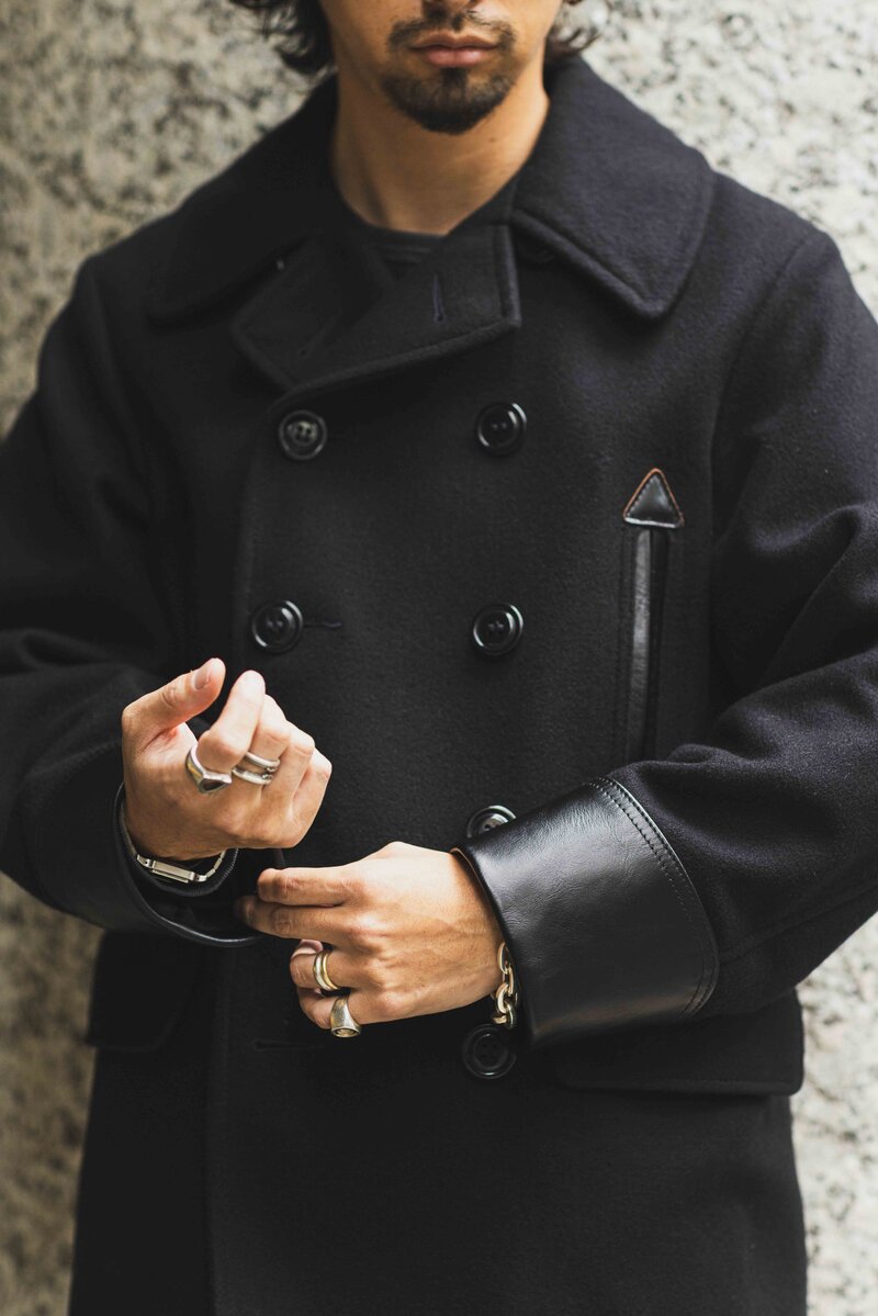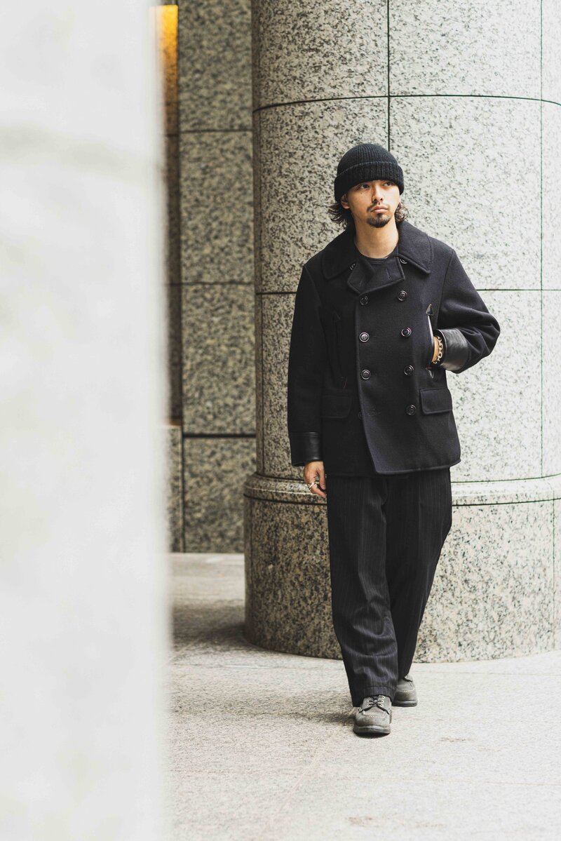 ブラウンレザーの表面に黒やグレーなど別の色で染色した茶芯と呼ばれる革が袖やポケットにあしらわれたピーコート。使い込むほどにスレや摩擦で下地の茶色が覗き、経年変化でヴィンテージのような風合いが増していきます。112年の歴史を誇る老舗ブランドSchottのPRを務める山﨑さんも、「10年、20年と着て育てる楽しさがあり、それだけの耐久性もある」と絶賛。日本製の馬革をアメリカで縫製したこだわりの仕様も魅力です。