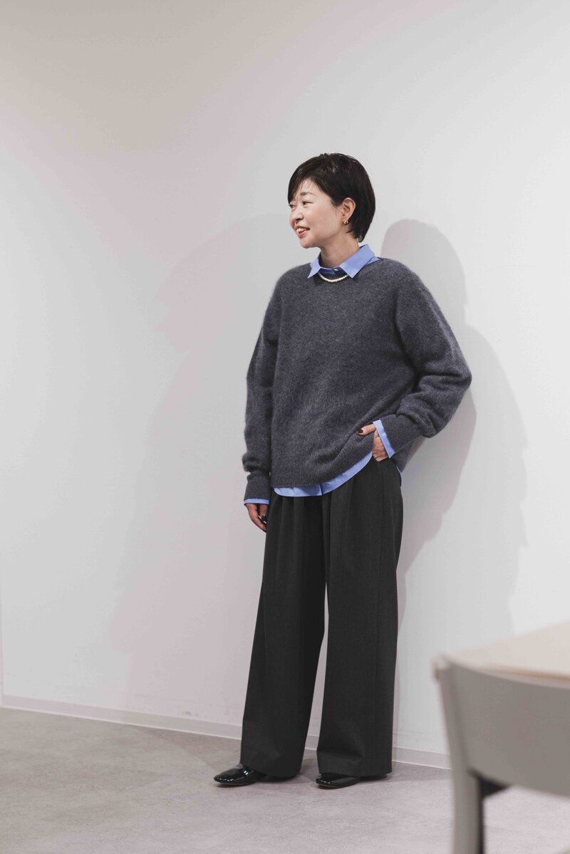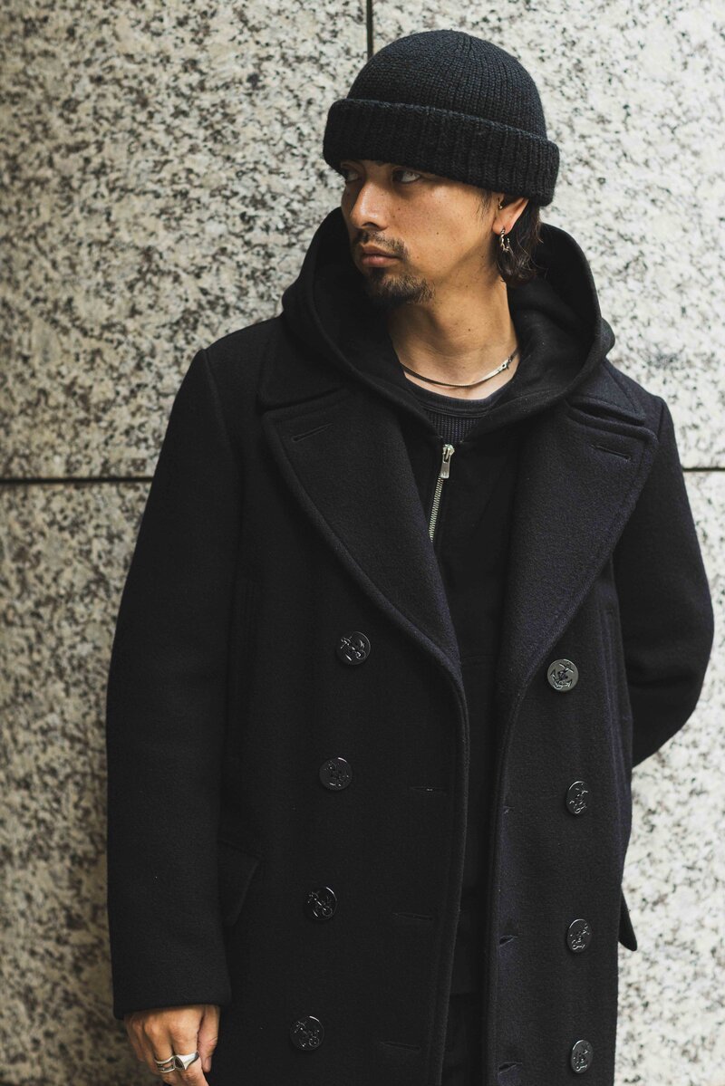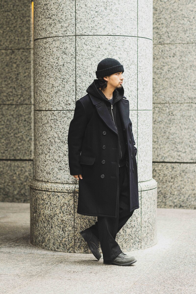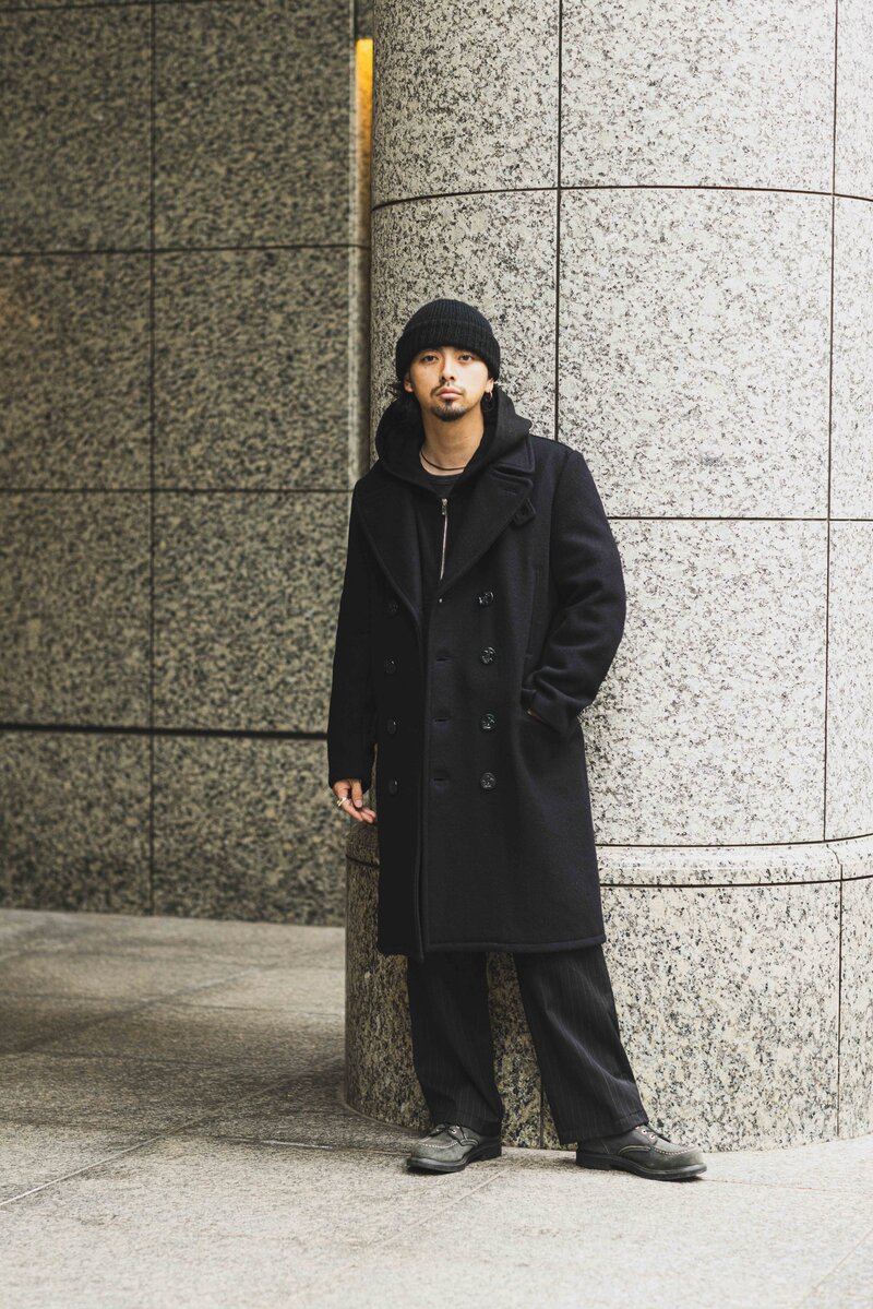 ブラウンレザーの表面に黒やグレーなど別の色で染色した茶芯と呼ばれる革が袖やポケットにあしらわれたピーコート。使い込むほどにスレや摩擦で下地の茶色が覗き、経年変化でヴィンテージのような風合いが増していきます。112年の歴史を誇る老舗ブランドSchottのPRを務める山﨑さんも、「10年、20年と着て育てる楽しさがあり、それだけの耐久性もある」と絶賛。日本製の馬革をアメリカで縫製したこだわりの仕様も魅力です。