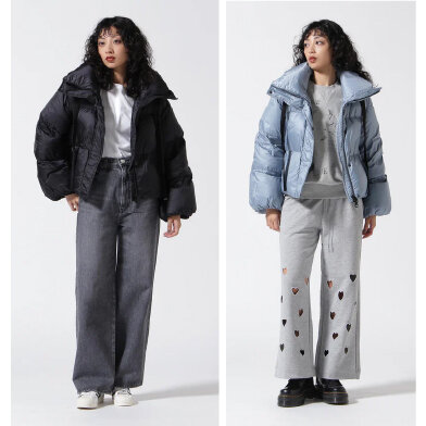 ふんわりとした丸みのあるノーステッチのボディデザイン、表地に使用されるしなやかで柔らかい肌触りのセミマットポリエステルツイル、ロゴレタリングが施された衿元から伸びるデザインポイントにもなるロゴテープ、防寒性と防風性を高めた比翼仕立てのフロントファスナー&スナップボタン仕様、フロントファスナーを開けても閉めても見映えよく決まる安定感のあるネックポイント、可動域を広げる両サイドの裾に施されたスナップボタン仕様など6つの個性をリュクス&カジュアルなスタイルで演出。