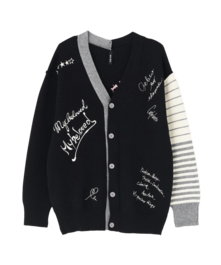 色々な手描きのメッセージやロゴが落書きのように書かれた遊び心のあるカーディガンです。