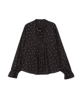 カジュアルなアイテムに上品なブラウスを合わせたスタイル