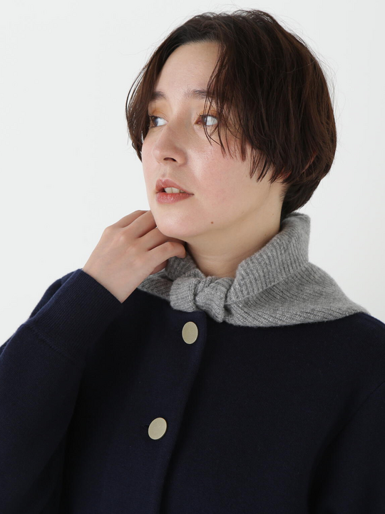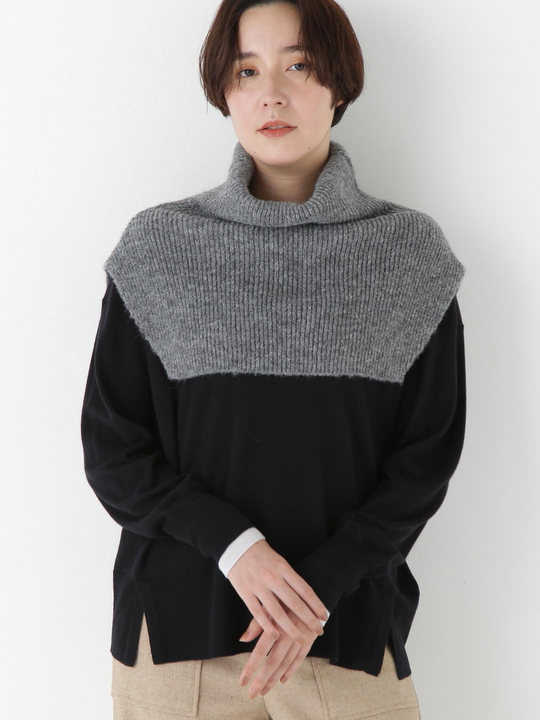 ブラウン×グレーの今年らしいカラーリングのコーデはマフラーにもなるハイネックショートベストをレイヤードしてひと癖をプラス。