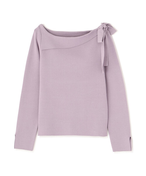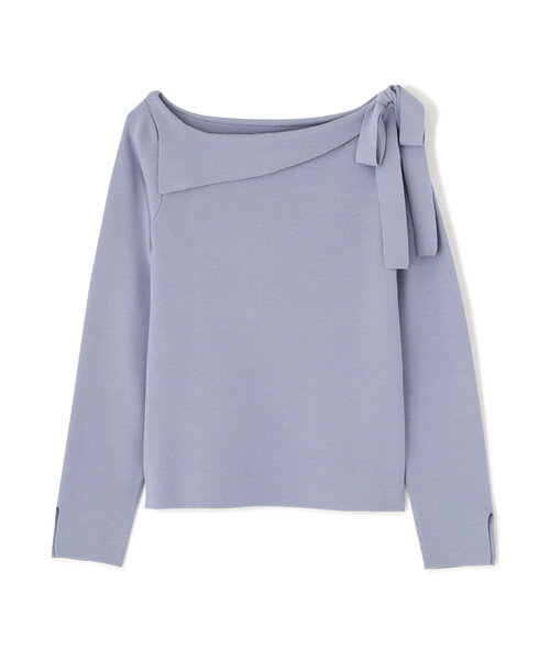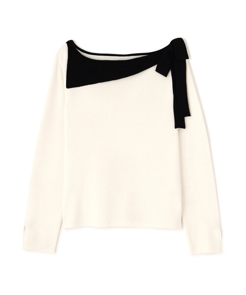 ネックラインを美しく演出する、洗練された大人の女性のためのニット。襟ぐりはアシンメトリーなラインに仕上げ、肩には同素材のリボンをあしらうことで、さりげない華やかさと上品さをプラスしました。