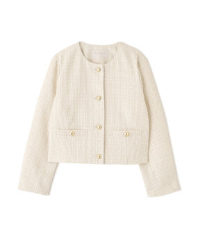 仕上げは短丈のツィードジャケット。コンパクトな着丈が重心をぐっと引き上げ、全体を好バランスに整えてくれます。素材の華やかさとシルエットの軽やかさを味方につけて、品よくフェミニンなスタイルが完成します。