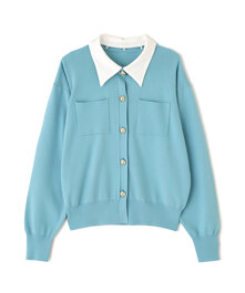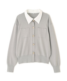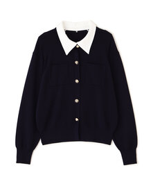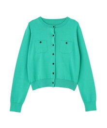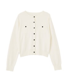胸元の小さなポケットと配色の黒蝶貝ボタンがアクセントになったニットカーディガン。さらっとしたタッチの糸で目面の細かい総針編みなのでオフィスシーンにも活躍。甘めのティアードスカートあわせも、ボタンの黒にあわせてピリッと全体を引き締めれば大人カジュアルスタイルの完成